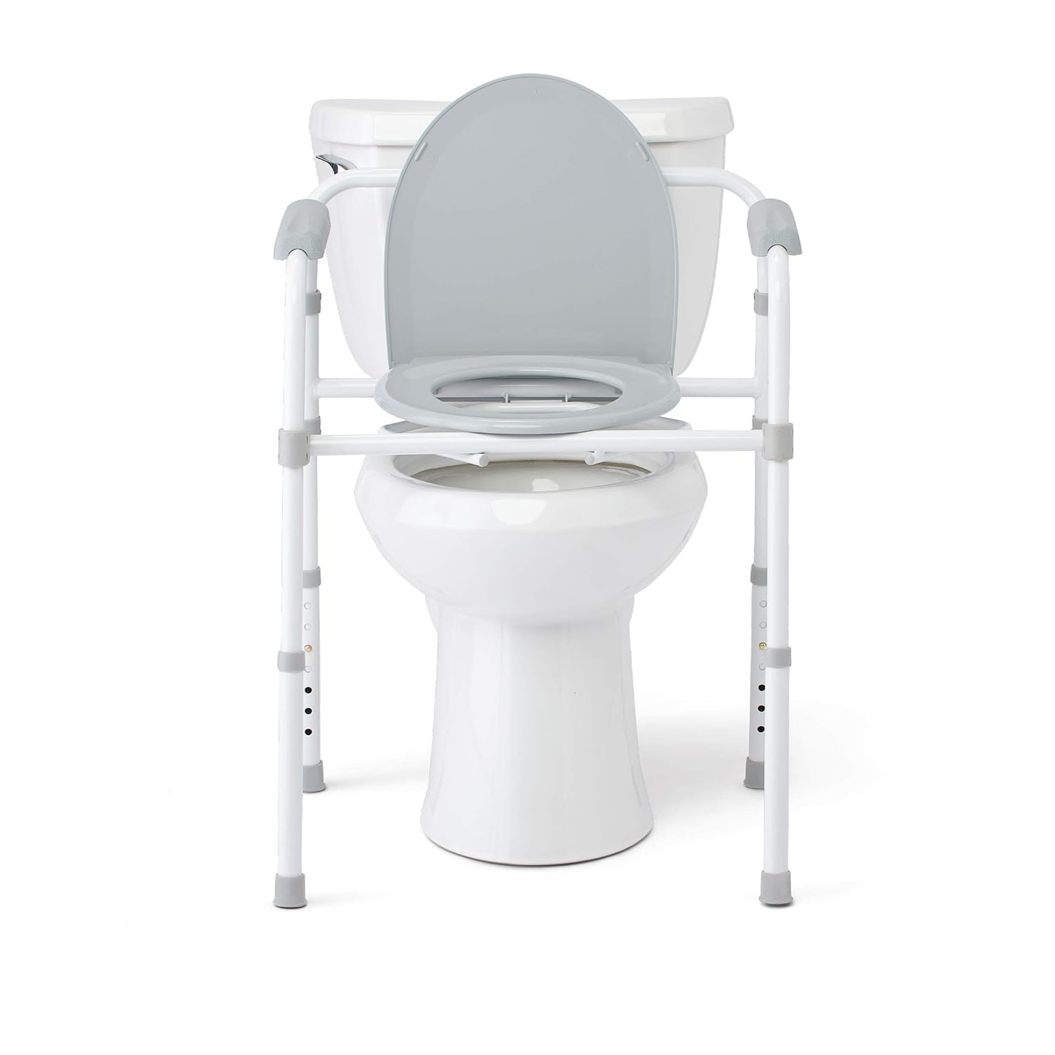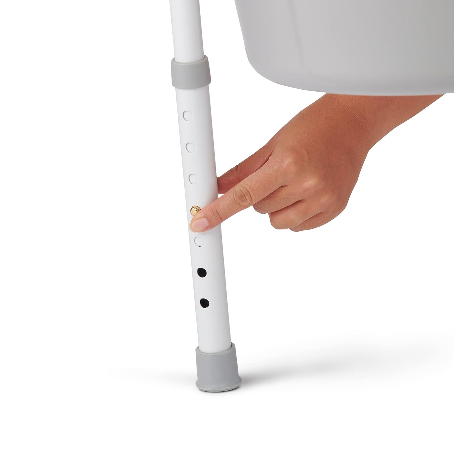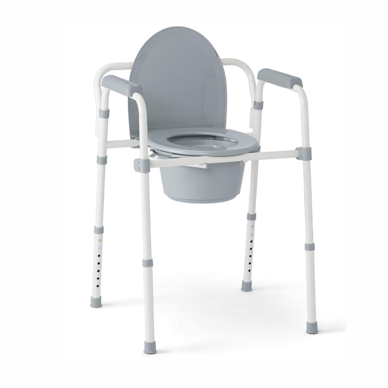 Folding, height adjustable Medline bedside Commode with 7.5 qt commode bucket with carry handle, cover and splash shield; and durable plastic Snap-On seat and lid